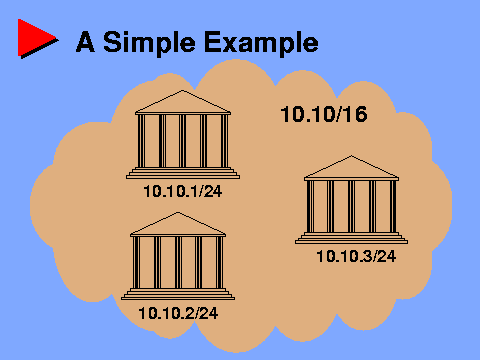 Ultimately, the campus buildings will be interconnected with routers, which will use the prefixes to direct traffic among the buildings. Those routers connecting the campus to other networks will advertise a single route, 10.10/16, for the entire university. Among themselves, the campus routers will use the longer subnet prefixes (like 10.10.1/24) to route traffic between the buildings.