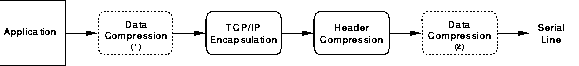 The second and third questions are more complex. To investigate them, several packet traces from FTP file transfers were analyzed/40/ with and without header compression and with and without L-Z compression. The L-Z compression was tried at two places in the outgoing data stream (fig. 10): (1) just before the data was handed to TCP for encapsulation (simulating compression done at the `application' level) and (2) after the data was encapsulated (simulating compression done in the modem). Table 1 summarizes the results for a 78,776 byte ASCII text file (the Unix csh.1 manual entry)/41/ transferred using the guidelines of the previous section (256 byte MTU or 216 byte MSS; 368 packets total). Compression ratios for the following ten tests are shown (reading left to right and top to bottom):