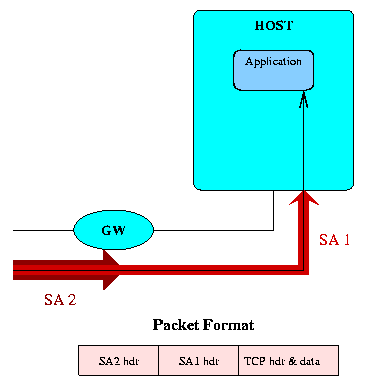 For example, one SA might protect all traffic through a gateway, while another SA would protect all traffic to a particular host. The packets finally routed across the network would be encapsulated in an SA bundle consisting of both SAs. The other side of the connection could be identical in design, consisting of a gateway implementing a tunnel SA, followed by a host implementing a transport SA, or the entire bundle could be terminated in a single host, which would then implement both SAs.