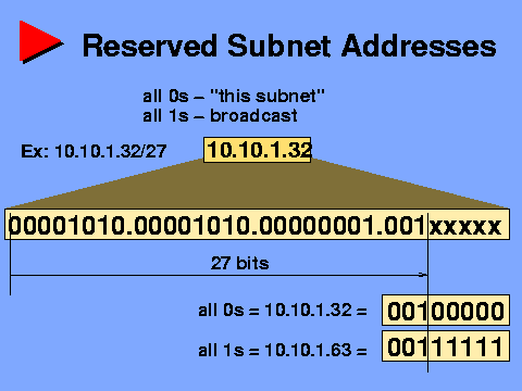 The all 0s address was used by older routing protocols to distinguish a subnet route from a 32-bit host route. The all 1s address was used to broadcast to all hosts on the subnet. Since newer routing protocols are fully capable of handling routing prefixes of any length, and anything that can be done with broadcast can be done better with multicast, both of these reserved addresses belong in the arcana of Internet history books. Unfortunately, some TCP/IP implementations still use these reserved addresses, and many more implementations maintain backwards compatibility, so it's best to err on the safe side and not assign these two addresses.