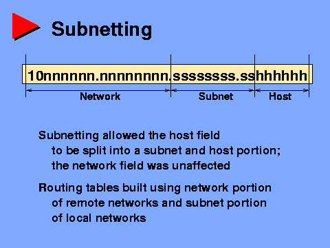 Subnetting splits the host field into subnet and host fields, creating a three-part address. The network field remains unchanged, and is determined via classful addressing as described earlier. The boundary between the subnet and host fields can fall between any two bits, and is determined using a subnet mask, assigned by the network engineer. The subnet mask is 32 bits long and is written in dotted decimal format, just like an IP address. Each bit in the mask is either 1 to identify bit positions in the network and subnet fields, or 0 to identify bit positions in the host field. The subnet mask, beginning with a sequence of 1 bits, and ending with 0 bits, was the precursor of the modern prefix length and is still widely used.