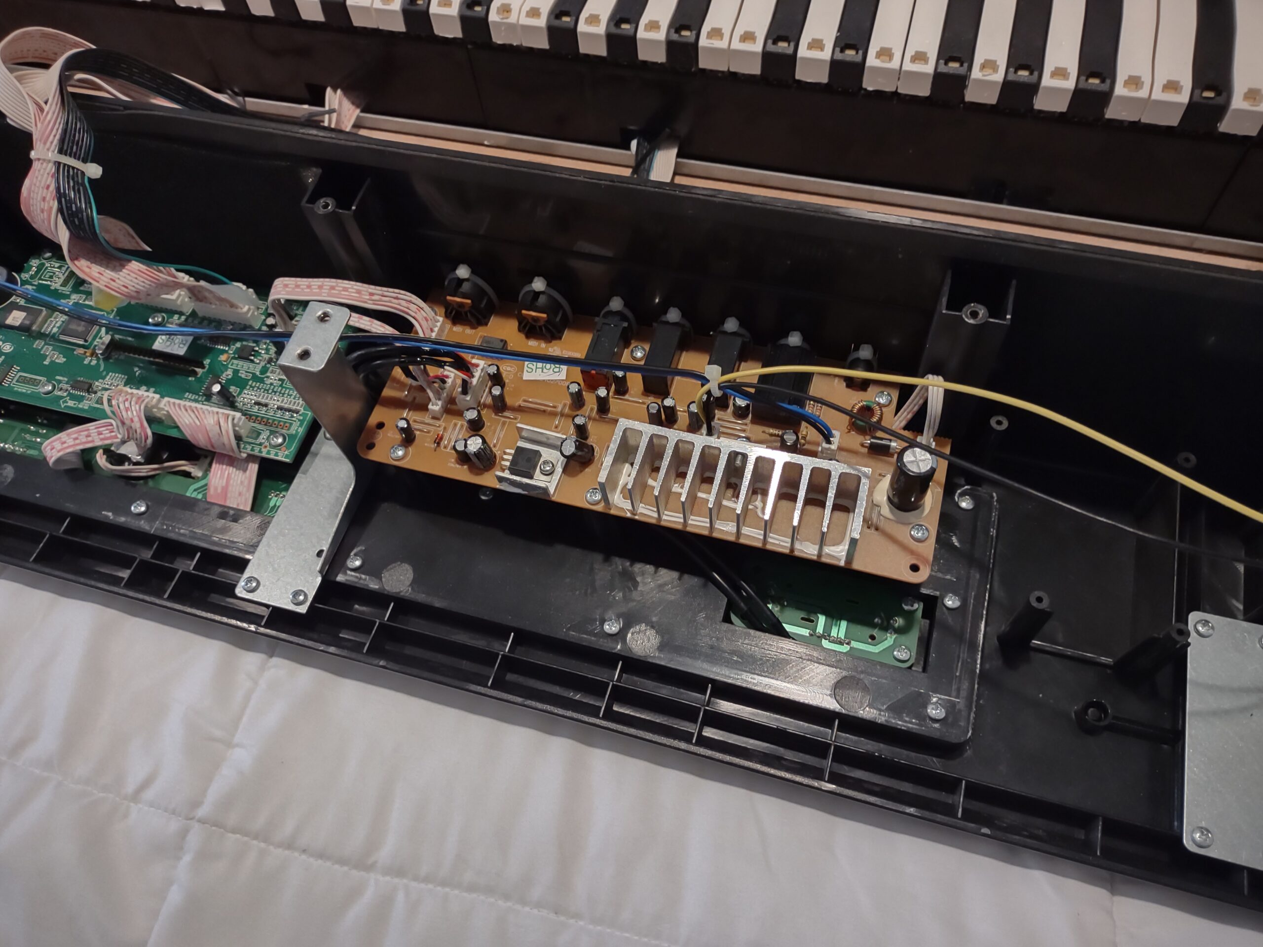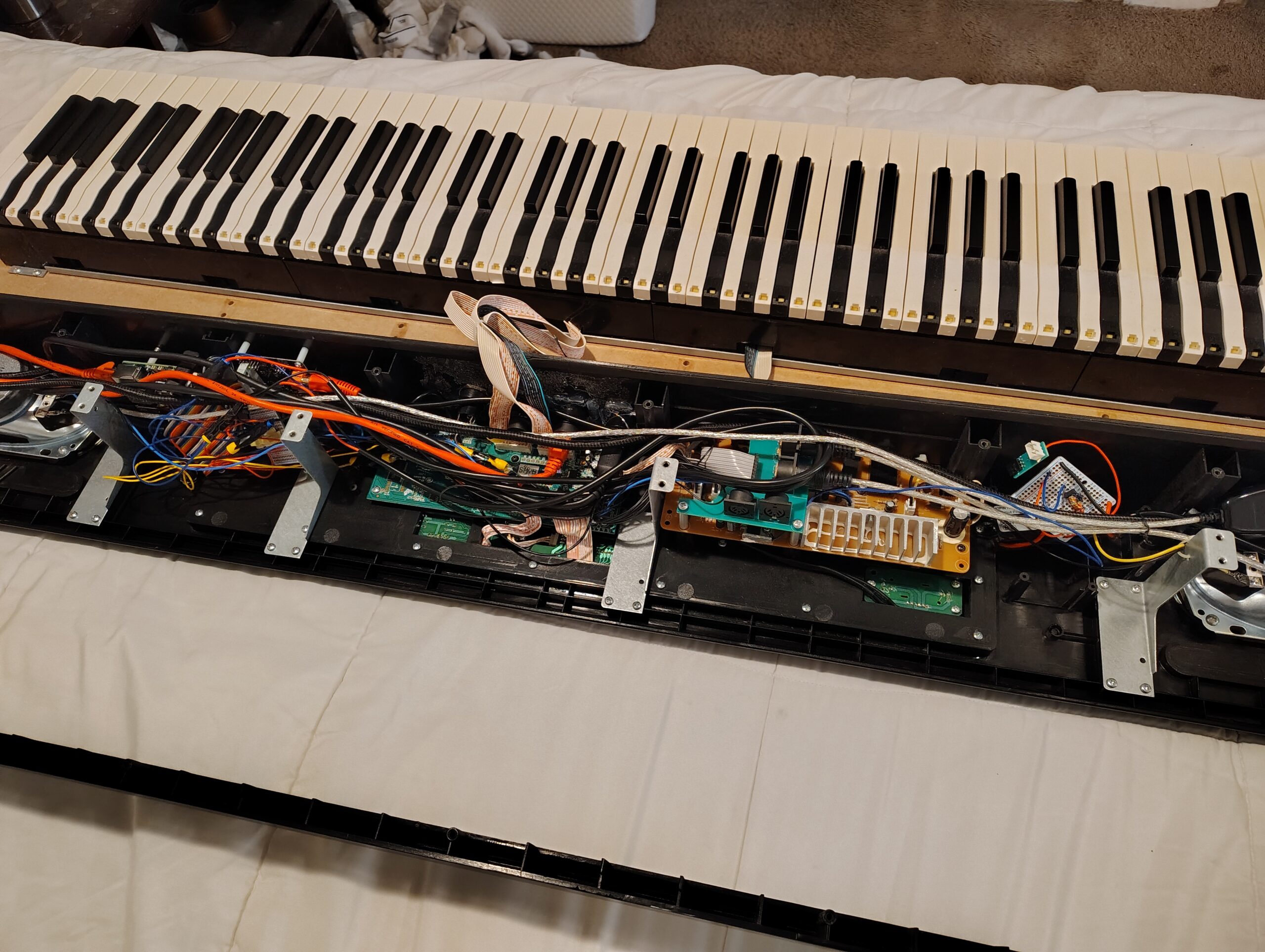 I started out by setting up a laptop next to the keyboard, connecting it with a cheap USB MIDI interface, and listening to it with headphones plugged into the laptop. After trying several combinations of operating system and software, I settled on Ubuntu 24 for an operating system and Ardour for a DAW (Digital Audio Workstation). Then I replaced the laptop with a Raspberry Pi 5 with an add-on sound card (a HiFiBerry DAC2 ADC Pro), wired the sound card into the keyboard’s amplifier stage, and mounted the Raspberry Pi and the HiFiBerry inside the case.