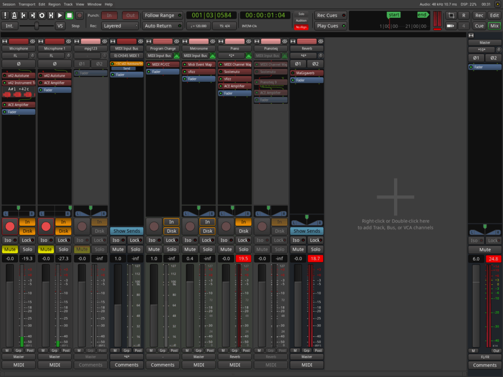 Ardour. I remember reading that Paul Davis wrote jack and some other program that I didn’t know anything about. That other program is Ardour! Basically, jack is a server and a library that allows MIDI and audio to be routed around between the programs in a Linux system. Ardour presents a user interface similar to the mixing board in a sound studio. I’ve got a X11 VNC server configured to start on boot, and Ardour configured to start automatically, load a default session and go into full-screen mode. Then I just connect a tablet to the WiFi and use a VNC client to connect the VNC server. It looks like this: